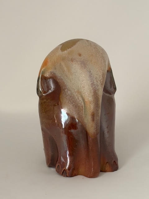 As wood logs are burned, the kiln temperature begins to rise and the atmosphere fills with floating ash. This fine fly ash gradually builds up on all of the exposed surfaces of the work inside. Once the temperature inside the kiln exceeds 2000 degrees Fahrenheit from continuously adding more and more wood, the wood ash begins to melt, run, and ultimately glaze each piece of sculpture. This random layering of wood ash glaze onto the surface results in one of a kind sculptures with beautiful colors and patinas.