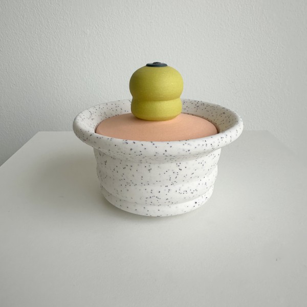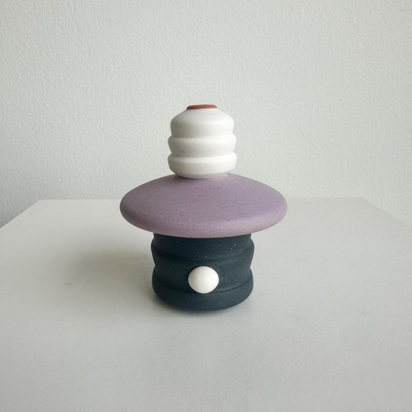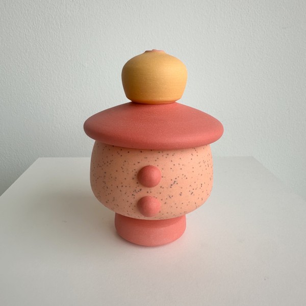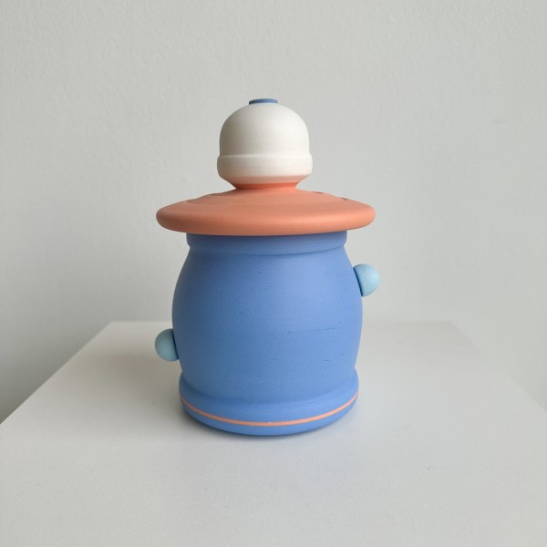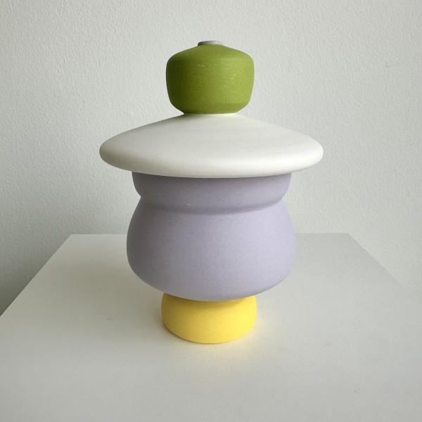 “My pots are an investigation of items I find curious, feel sentimental towards, or objects I find humor in. This investigation could come from the object’s surface, form, or most often from intriguing proportion or scale. Inflated swells, large knobs, and enamel-like sheens from sanded surfaces and glazes create exaggerated, vibrant pieces.