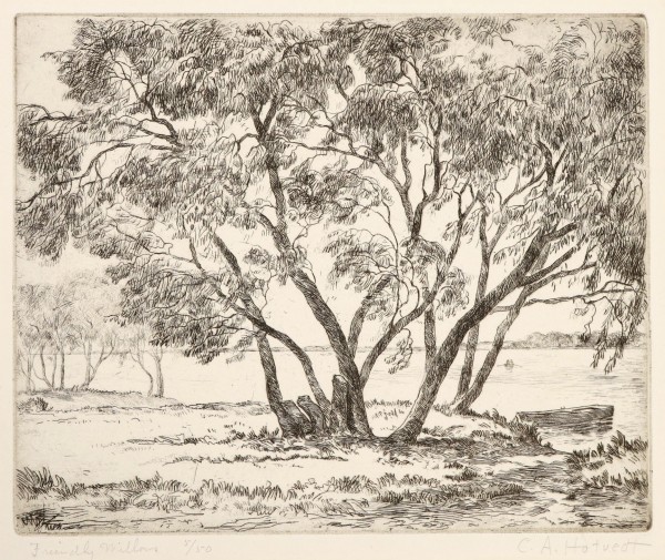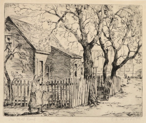 (1900-1991) Born in Eau Claire, Wisconsin, Clarence Hotvedt was both a painter and etcher. After studying in Minnesota, Chicago, and New York, he moved to Wichita, Kansas, to work for Western Lithograph Co with C.A. Seward, where years later he became Art Director. Hotvedt, in a chance meeting on the street with fellow student Edmund Kopietz, learned that Seward had a job opening. Clarence was also the first paid instructor at the School of the Wichita Art Association in 1924. His work primarily focused on the Midwest and much later, historic buildings of Wichita. Although he worked in aquatint, lithograph, block printing, etching, oils and watercolors, Hotvedt was best known for his drypoint work. Clarence belonged to the Prairie Print Makers (Charter Member); Wichita Art Guild; California Printmakers; Allied Artists of Ft. Worth; Kansas Watercolor Society.