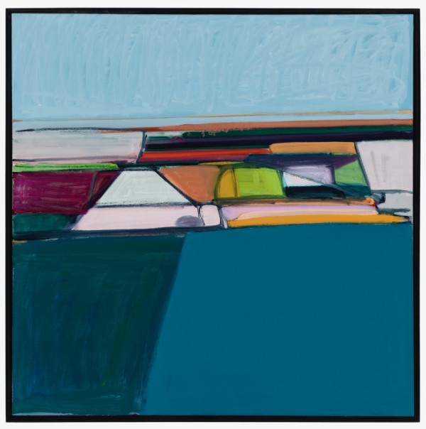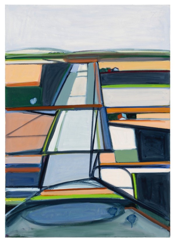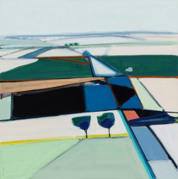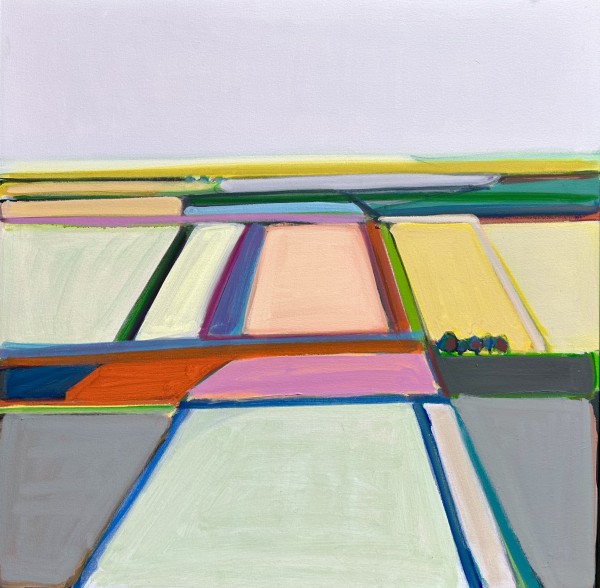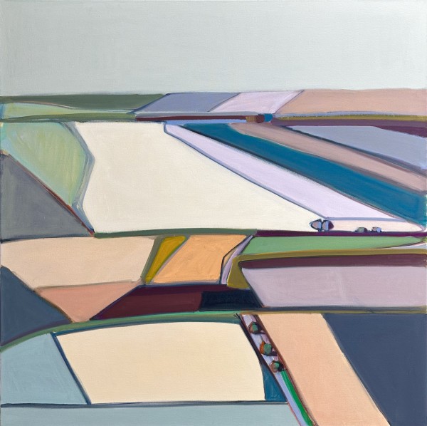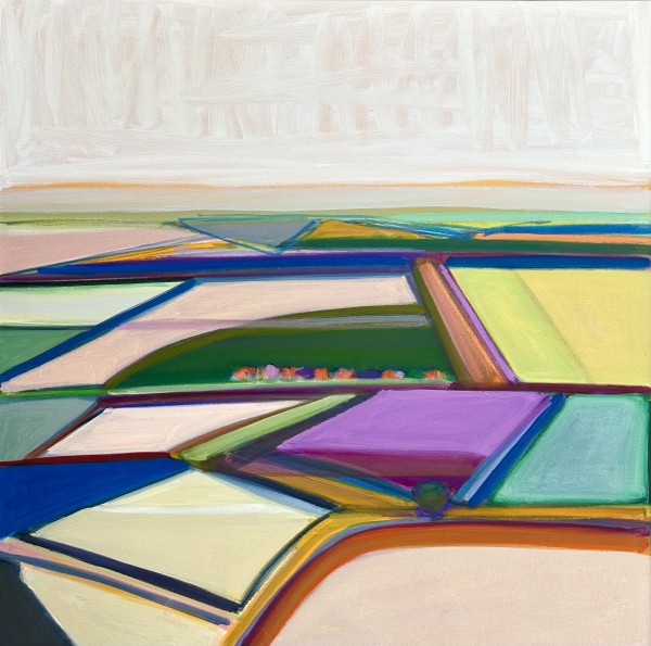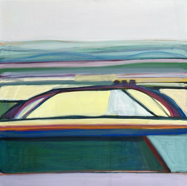 In these current works, I re-interpret the idea of traditional landscape. I am intrigued by the flat, open space and lack of verticals of the surrounding fields near my home in Kansas. The terrain and roads are geometric and simplified. Abstraction is the result of my quest to capture the feel of this region.