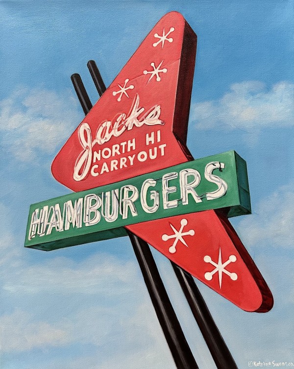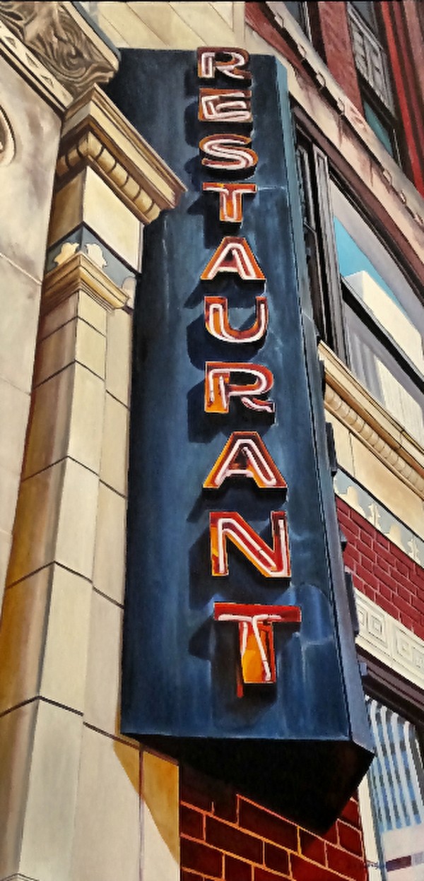 “…I would wander around Omaha’s Old Market and the surrounding areas, taking pictures of interesting corners and shop fronts. I’d then take my pictures and do realistic paintings of them. I did several series of them, including a series of night paintings.