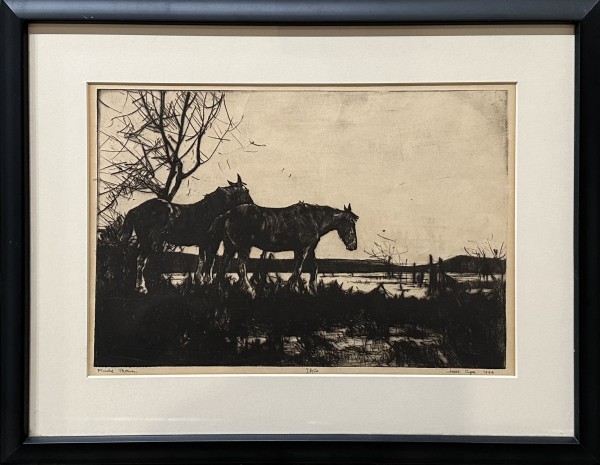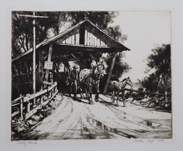 Leslie Cope, painter, printmaker, and designer, was born in Stoke-on-Trent, England on August 10, 1913. His father, Sidney Cope, was a master potter and designer who fostered his son’s artistic tendencies. He moved his family to eastern Ohio in 1929 where he designed tiles for the Mosaic Tile Company in Zanesville. After two years, he became the designer for the Nelson McCoy Pottery Company in Roseville, Ohio. Leslie worked with his father at McCoy Pottery as a designer until he joined the United States Army Air Corps during World War II. He was stationed on Guam and worked as a camouflage artist in the South Pacific.