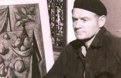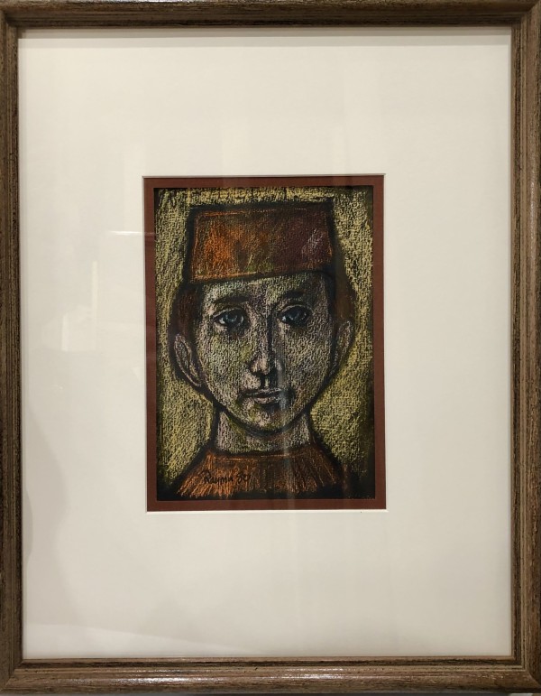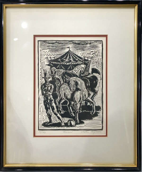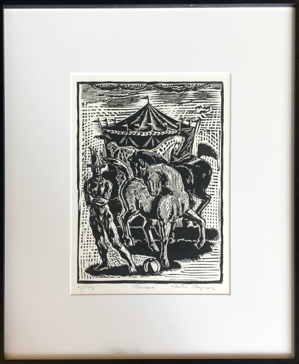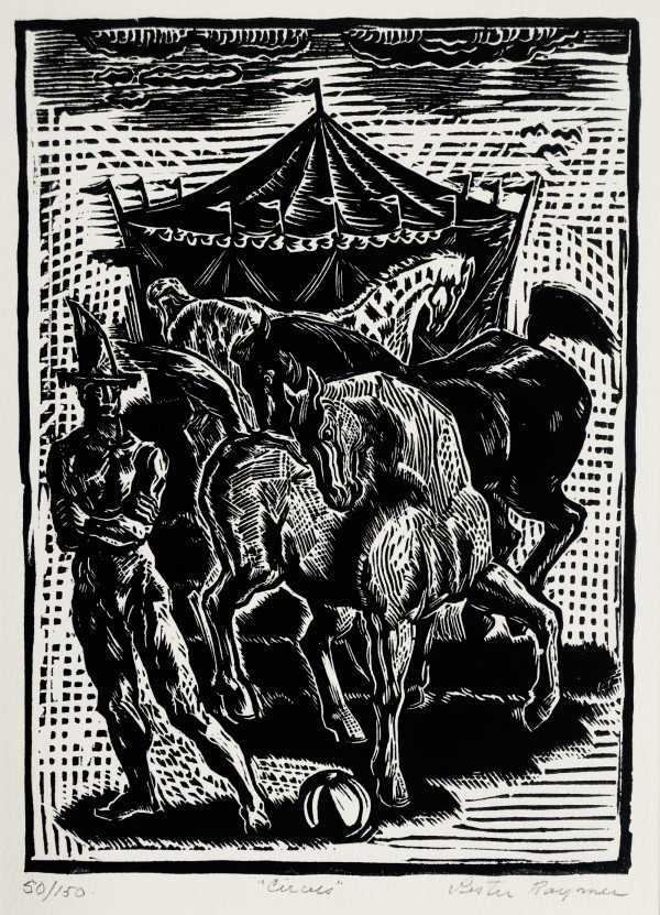 (American 1907-1991) Professional artist and craftsman, Lester Raymer, studied at the Chicago Art Institute. His work was mostly influenced by great master painters, religious symbolism and folk art. Much of his work was made from recycled materials and his medium ranged from painting, printing, ceramics, metalwork, woodcarving, stitchery, toy-making, furniture and jewelry. Much of his work can be viewed at his personal studio, The Red Barn Studio in Lindsborg, Kansas, which was restored and opened as a museum in 1997.