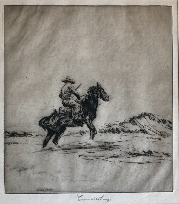 (1900-1968) Levon West was a pioneer in color photography shooting under the name Ivan Dmitri. He gained recognition as a print maker in 1927 when his etching “The Spirit of St. Louis” was published upon Lindbergh’s arrival in Paris. In 1932 he was named guest artist of the State of Colorado where he did a familiar series of etchings on Western life.