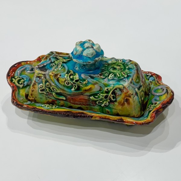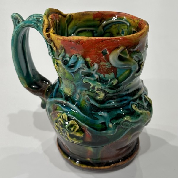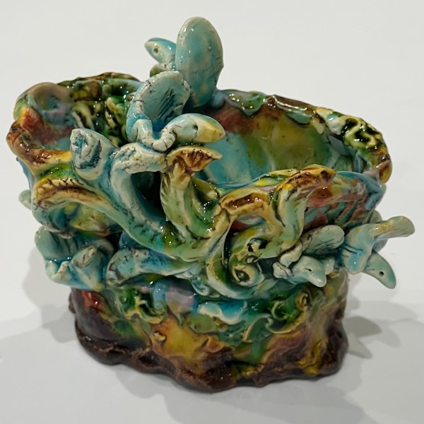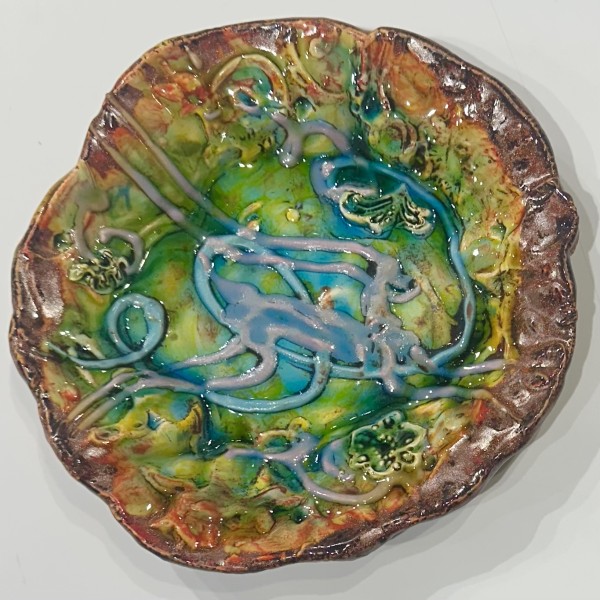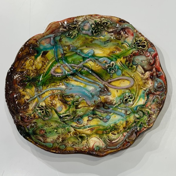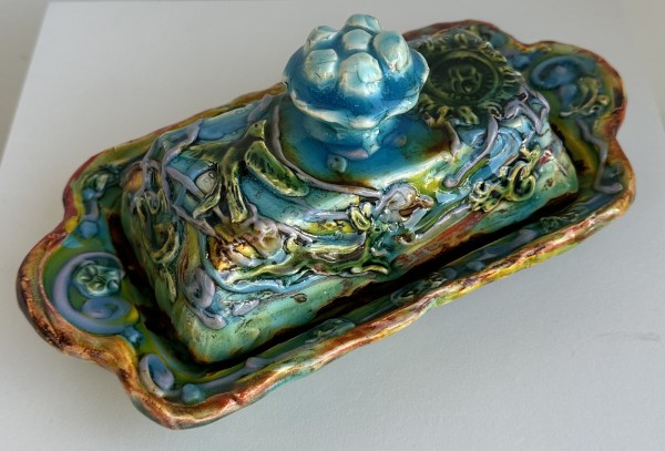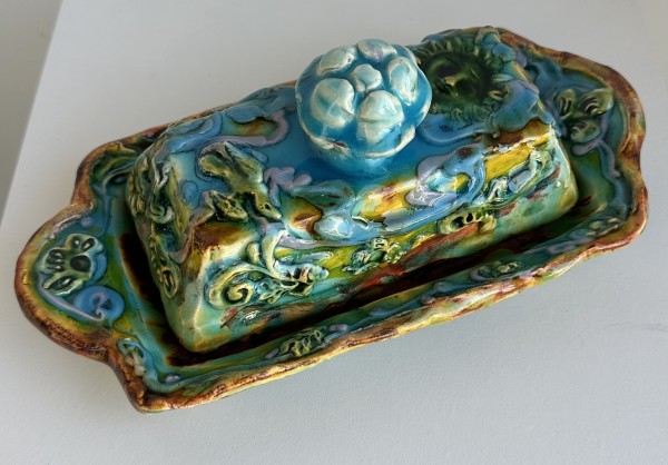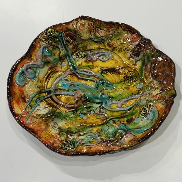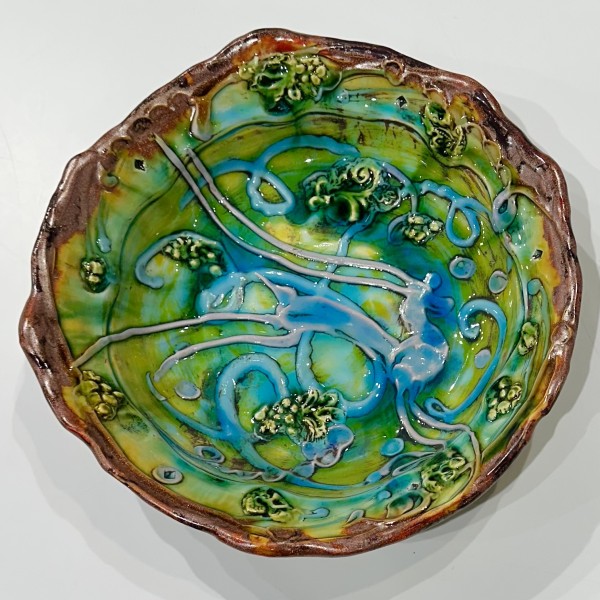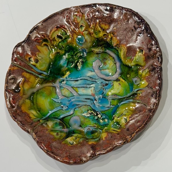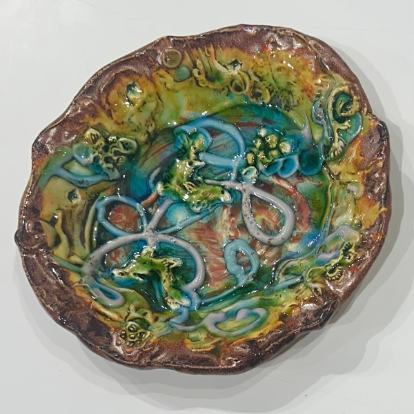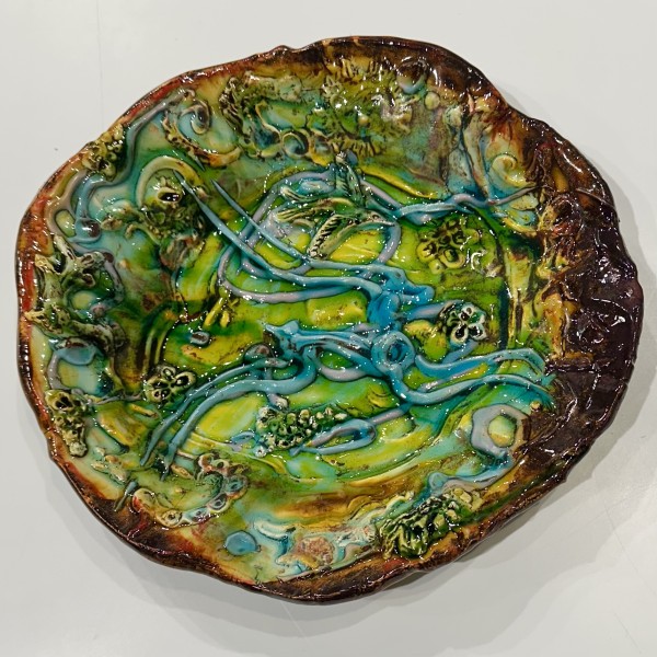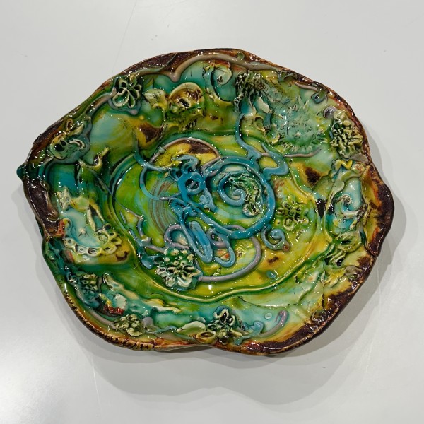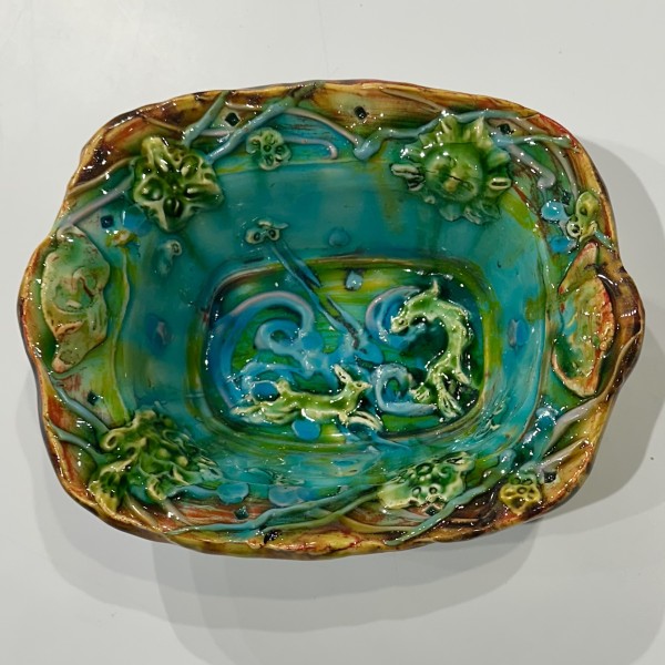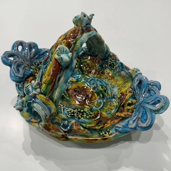 “My artworks for the table refer to traditional porcelain or restaurant whiteware but with softer forms inspired by the playful and abundant qualities of Mexican earthenware. I invented my own production process after studying clay mold fragments in antiquated factories and museums. After forming pieces in molds, on the wheel, or both, I finish with gestural animals, stamps, slips, sprigs, and multi-hued glazes. To some, my jewel-tone glaze colors evoke a healthy garden in bloom or an underwater seascape. The colors, textures, and strength of my forms set my work apart; my forms are muscular and strong but also fluid. I engage both ends of the spectrum, from the dynamic and substantive to the detailed and dreamy—I celebrate tiny surprises in my work. My colorful, shapely earthenware looks best holding a freshly prepared meal on the table.”