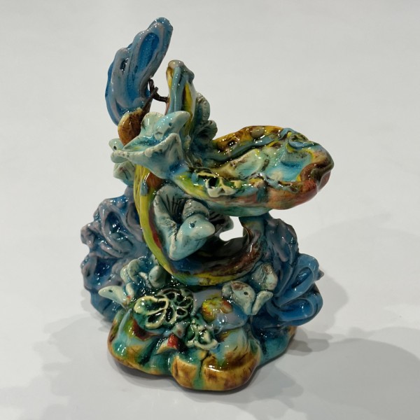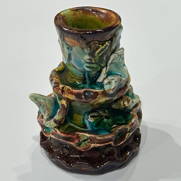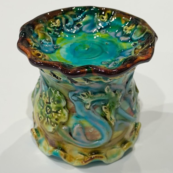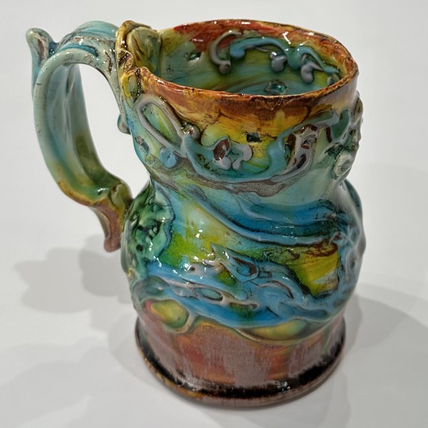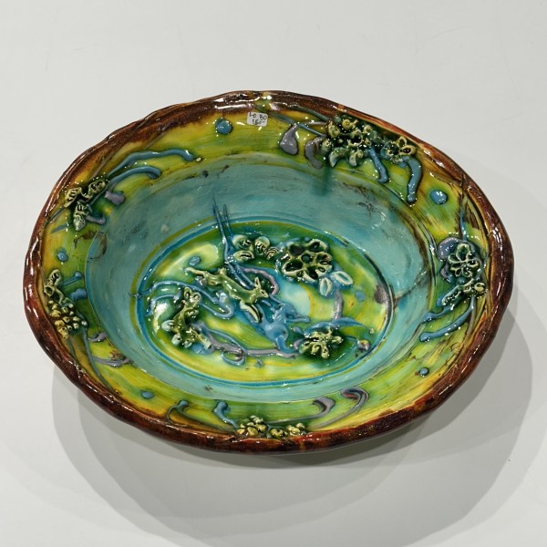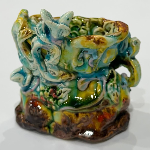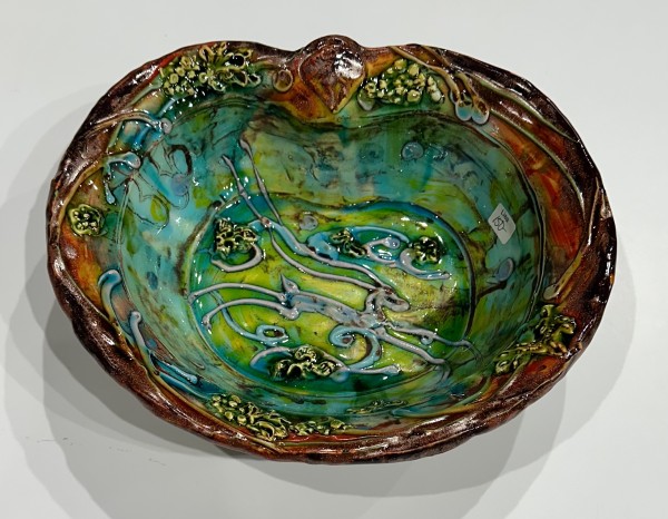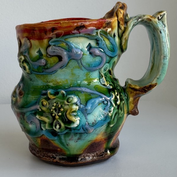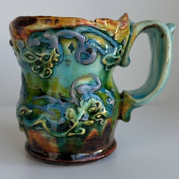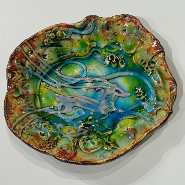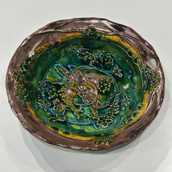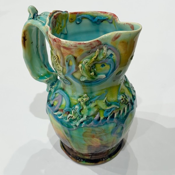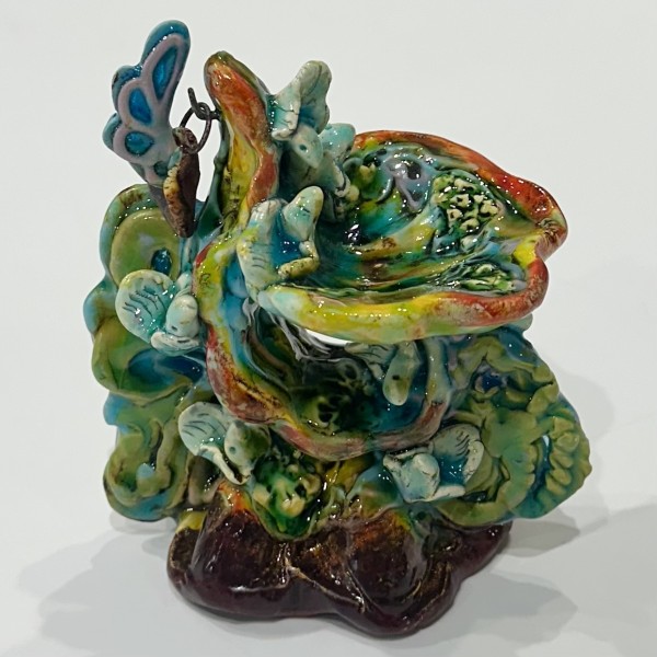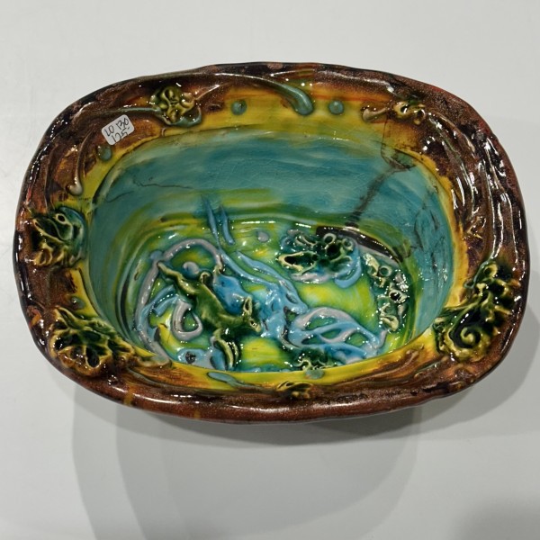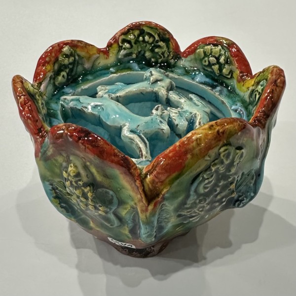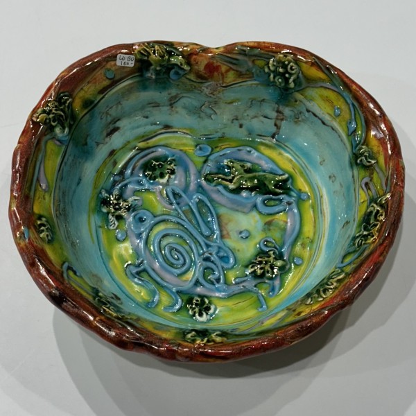 “My artworks for the table refer to traditional porcelain or restaurant whiteware but with softer forms inspired by the playful and abundant qualities of Mexican earthenware. I invented my own production process after studying clay mold fragments in antiquated factories and museums. After forming pieces in molds, on the wheel, or both, I finish with gestural animals, stamps, slips, sprigs, and multi-hued glazes. To some, my jewel-tone glaze colors evoke a healthy garden in bloom or an underwater seascape. The colors, textures, and strength of my forms set my work apart; my forms are muscular and strong but also fluid. I engage both ends of the spectrum, from the dynamic and substantive to the detailed and dreamy—I celebrate tiny surprises in my work. My colorful, shapely earthenware looks best holding a freshly prepared meal on the table.”