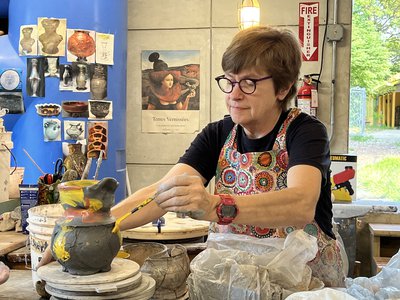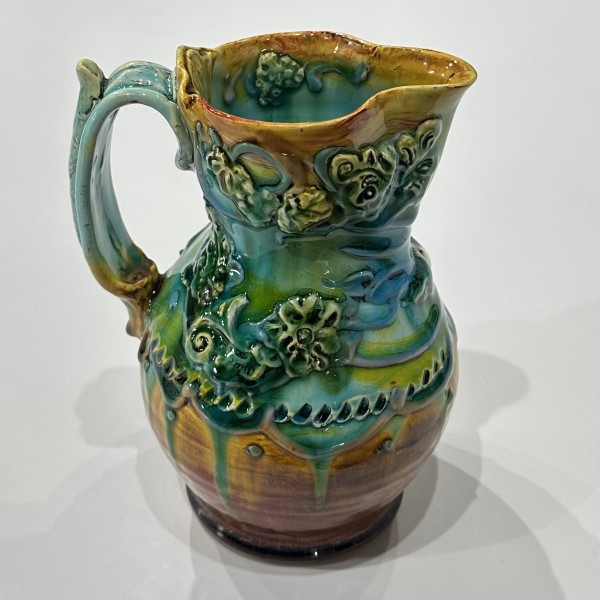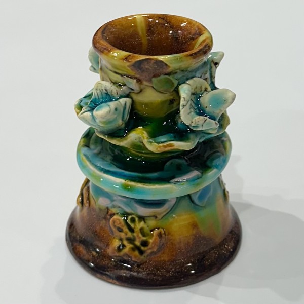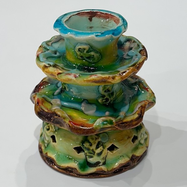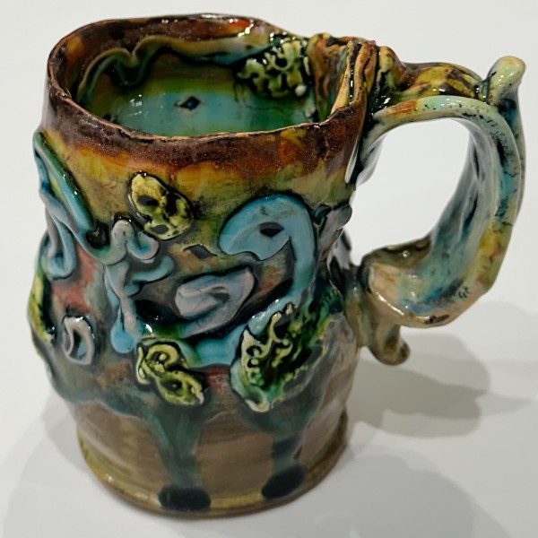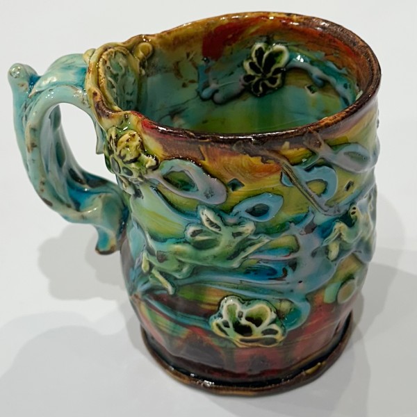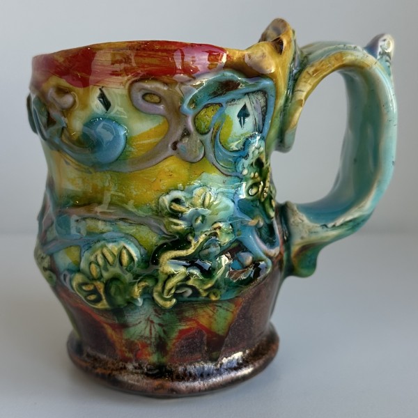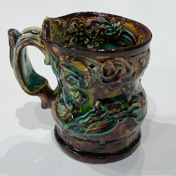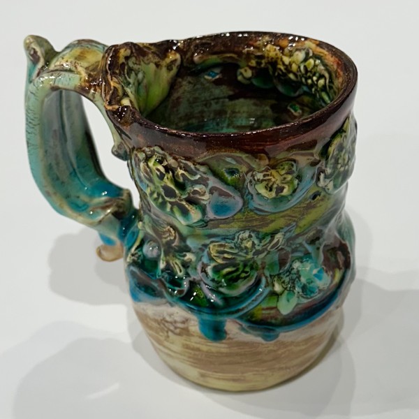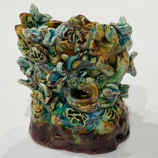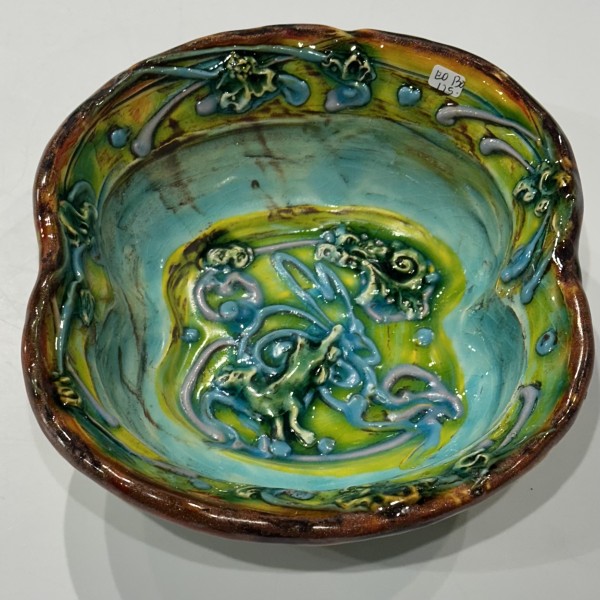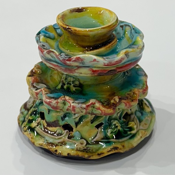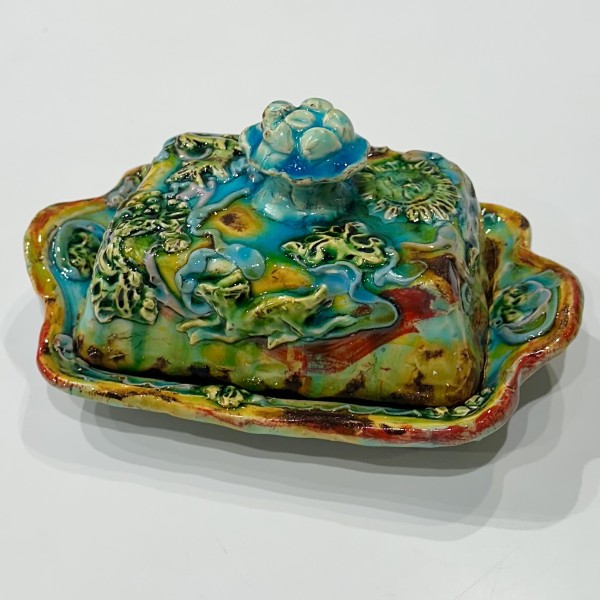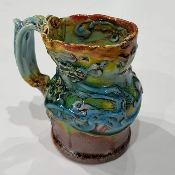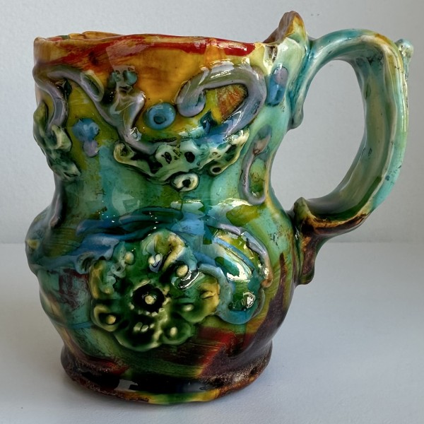 “My artworks for the table refer to traditional porcelain or restaurant whiteware but with softer forms inspired by the playful and abundant qualities of Mexican earthenware. I invented my own production process after studying clay mold fragments in antiquated factories and museums. After forming pieces in molds, on the wheel, or both, I finish with gestural animals, stamps, slips, sprigs, and multi-hued glazes. To some, my jewel-tone glaze colors evoke a healthy garden in bloom or an underwater seascape. The colors, textures, and strength of my forms set my work apart; my forms are muscular and strong but also fluid. I engage both ends of the spectrum, from the dynamic and substantive to the detailed and dreamy—I celebrate tiny surprises in my work. My colorful, shapely earthenware looks best holding a freshly prepared meal on the table.”