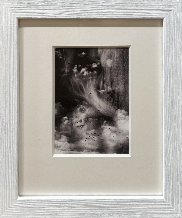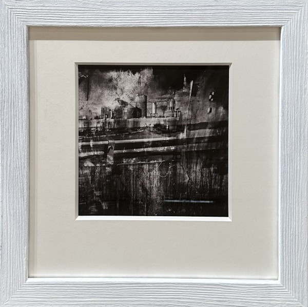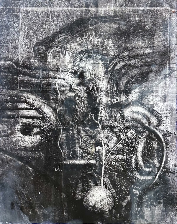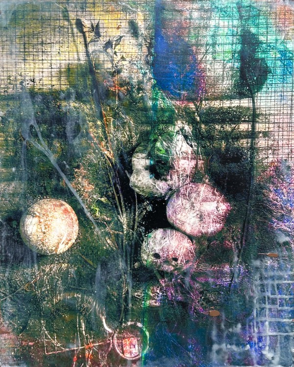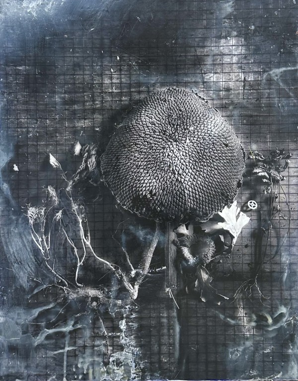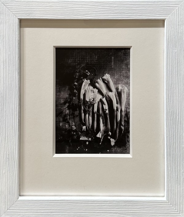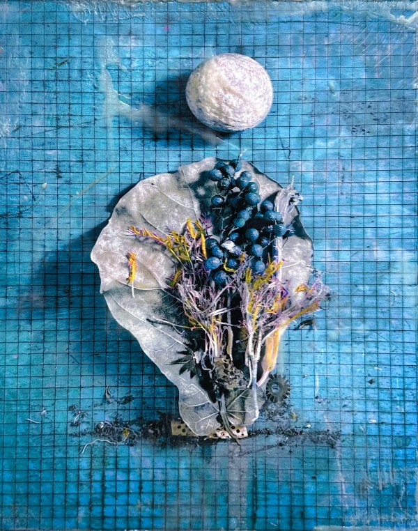 “My work is generally about the relationship between painting to photography. The images in this exhibit are explorations of organic forms and other miscellany played against the wooden grid of a large vintage paper cutter. They provide interesting visual textures. Each piece works to expand photographic language through the combined influence of abstract composition played against real photography. I have titled the pieces with familiar song titles so that the viewer, if they are familiar with the music, will hear the song in their head which will facilitate a connection between my mind and theirs. I have always been involved with the surface of my paper, often showing swathes of gelatin silver paper torn at either end. I want the viewer to experience my paper in the way I do. Using encaustic to finish these images lets me work that surface further and enhance metaphorical possibilities.”
