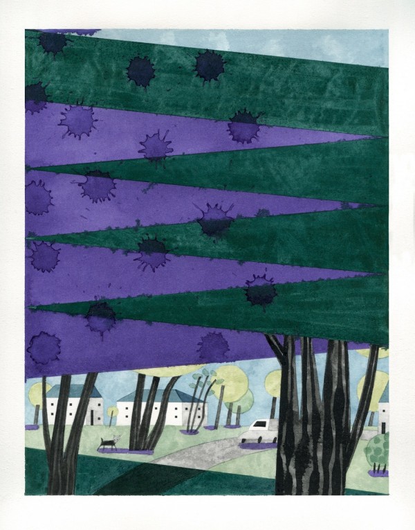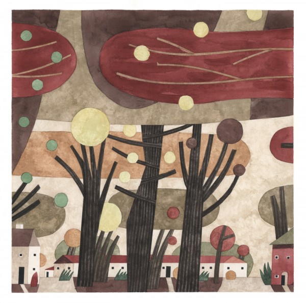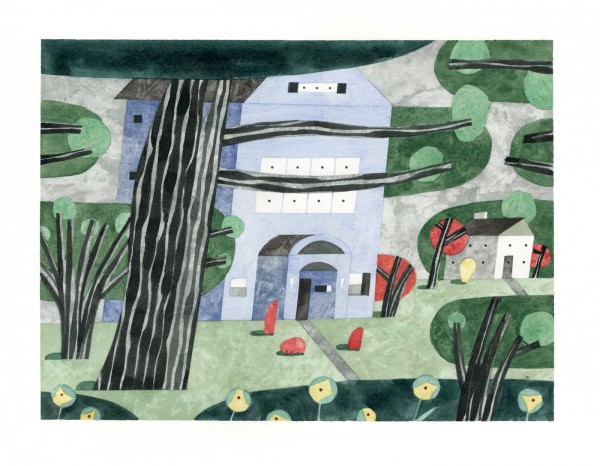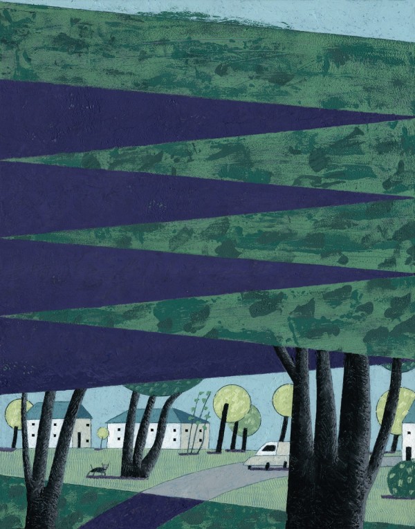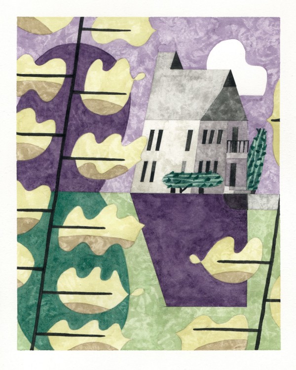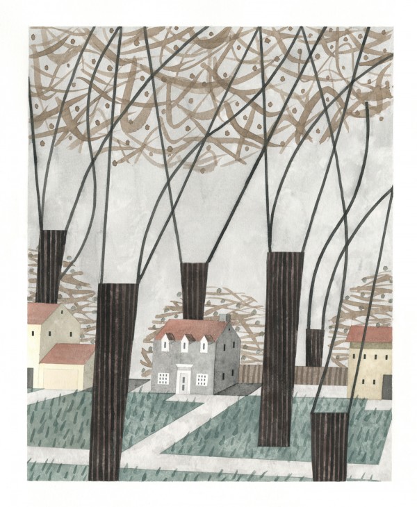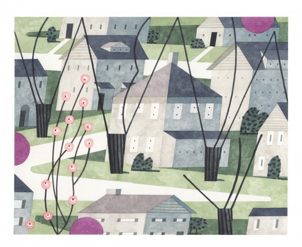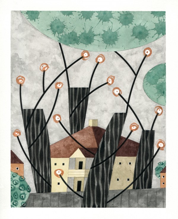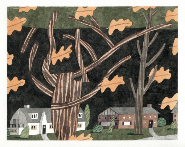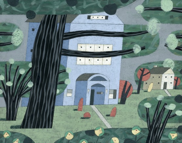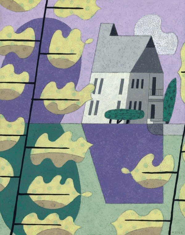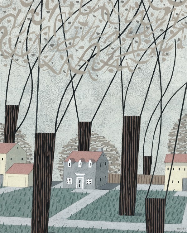 “I paint houses and trees because they are adversaries. I am telling the story of how these two forces live together. Houses want permanence. They are a pile of bricks and want to be left alone. Trees want change. They want to grow. They make more trees. They crack sidewalks and bring down chimneys.” -Rebecca Hoyer