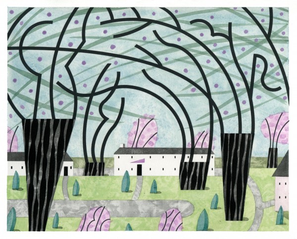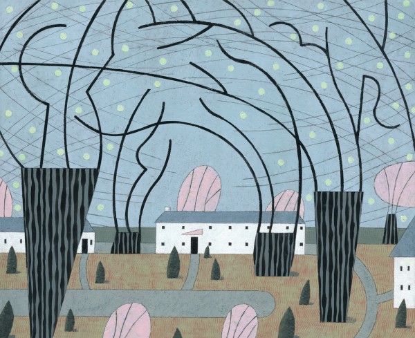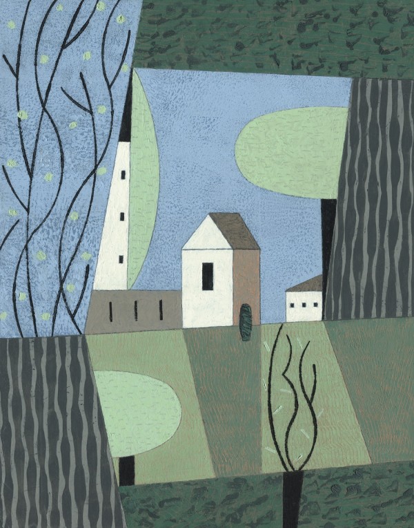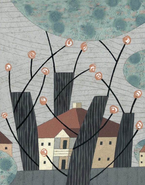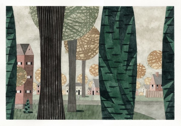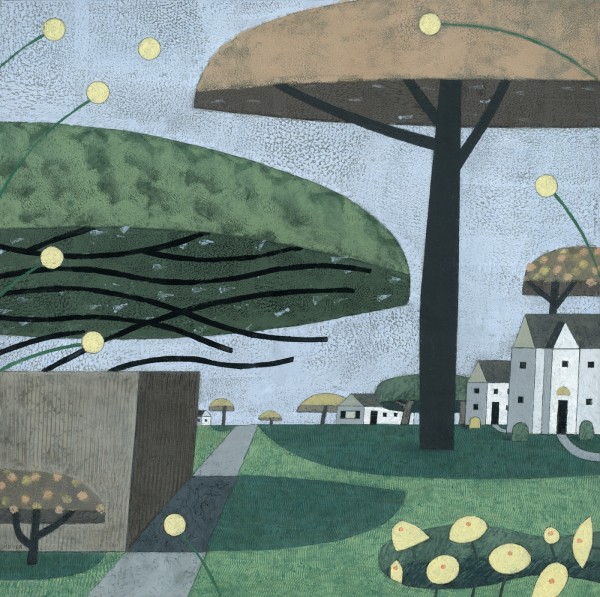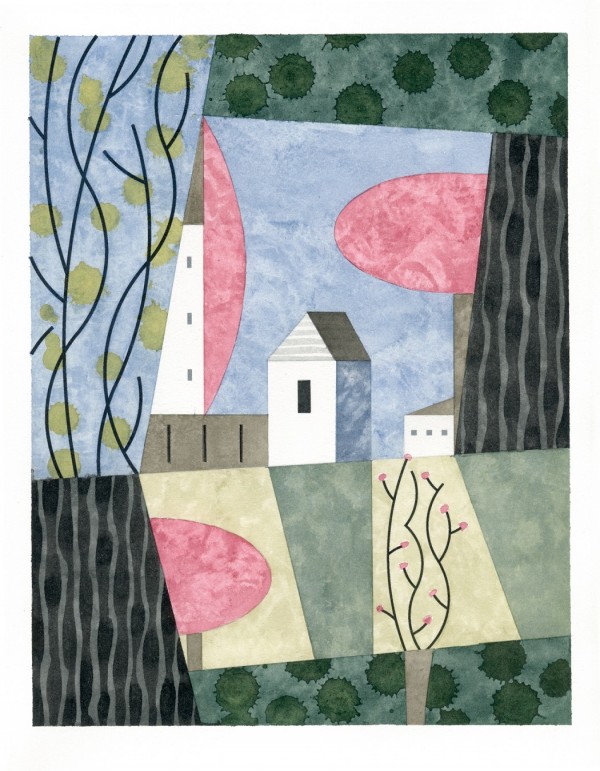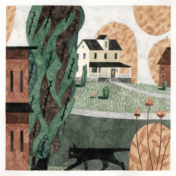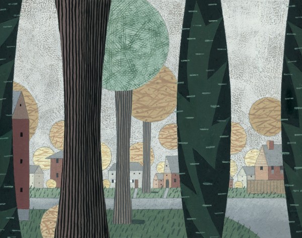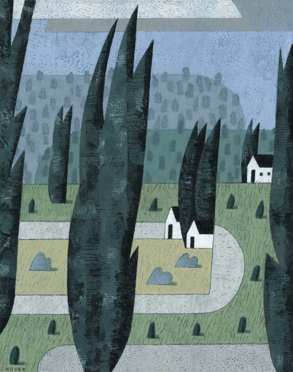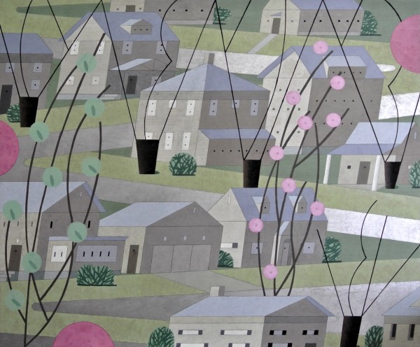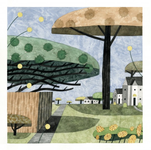 “I paint houses and trees because they are adversaries. I am telling the story of how these two forces live together. Houses want permanence. They are a pile of bricks and want to be left alone. Trees want change. They want to grow. They make more trees. They crack sidewalks and bring down chimneys.” -Rebecca Hoyer
