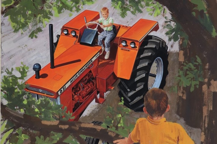 Allis Chalmers Advertisement Art, “D21 (Boy in Tree)”, gouache (SOLD) A boy in a tree looking down on a D21 Allis Chalmers tractor.