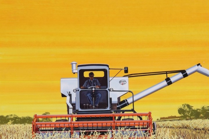 Allis Chalmers Advertisement Art, “Gleaner C – Wheatfield”, gouache (SOLD) Bright yellow sky and a Gleaner C harvesting wheat.
