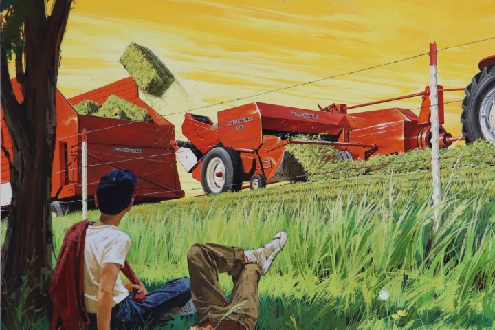 Allis Chalmers Advertisement Art, “Untitled (Boys and Hay Bales)”, gouache (SOLD) Two boys under a tree in the shade watching a tractor harvest.
