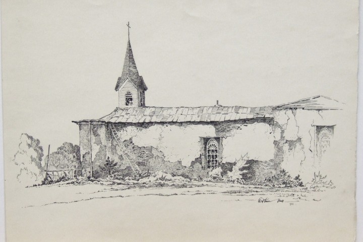 Arthur W. Hall, “Los Lunas”, ink over graphite Ink drawing of church in Los Lunas. Unframed, signed and dated.