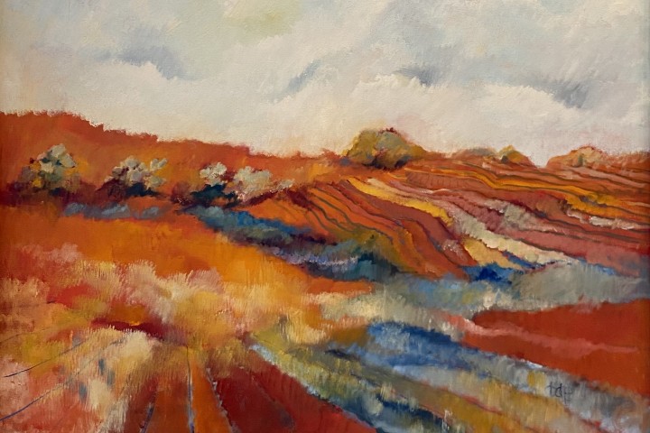 Beverly Dodge Radefeld, “Looking at the Hills,” oil on canvas (SOLD) An abstracted landscape of Kansas.