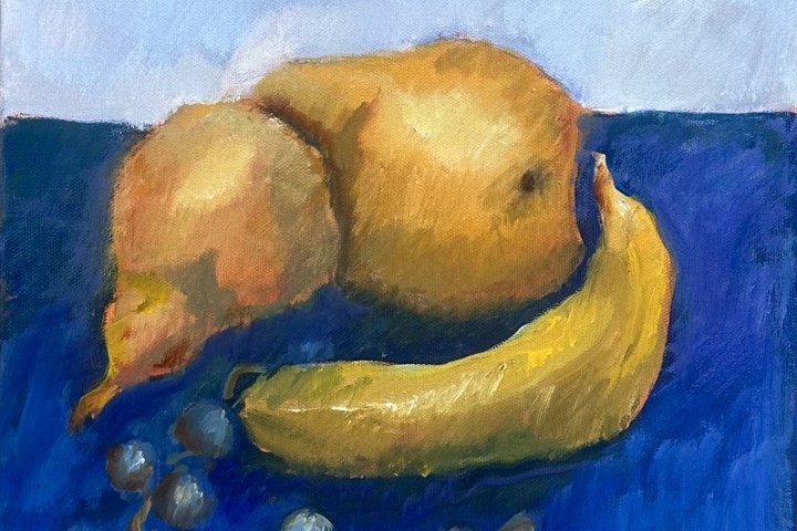 Beverly Dodge Radefeld, “Two Pears and a Banana”, oil on canvas