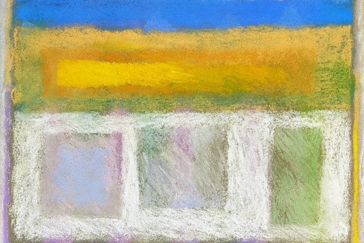Bob Regier, “Emerging Fields,” Pastel (SOLD) A colorful pastel piece. Framed in a natural oak wood frame.