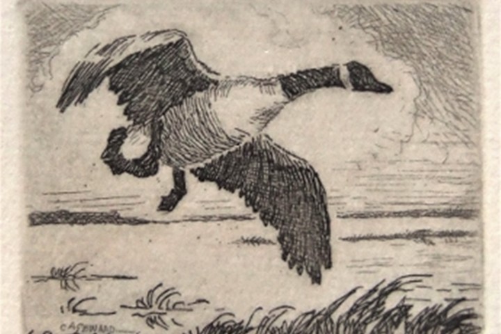C.A. Seward, “Lone Goose”, etching (SOLD) Etching of a lone goose in flight. Large margins, unsigned (Thompson Catalogue E44). Unframed.