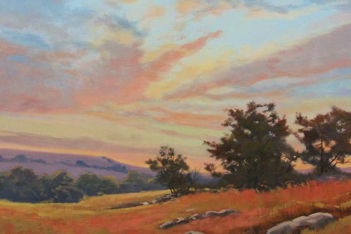 Cally Krallman, “Copper Clearing”, acrylic on canvas (SOLD) A large vertical landscape with rich copper foreground.