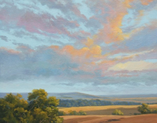 Cally Krallman, “Yonder Light”, acrylic on canvas (SOLD) A small vertical landscape of rolling hills and orange lit clouds.