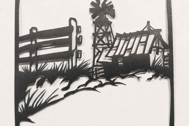 Clark Britton, “Fence, Windmill, and Barn”, paper cut (ARCHIVE)