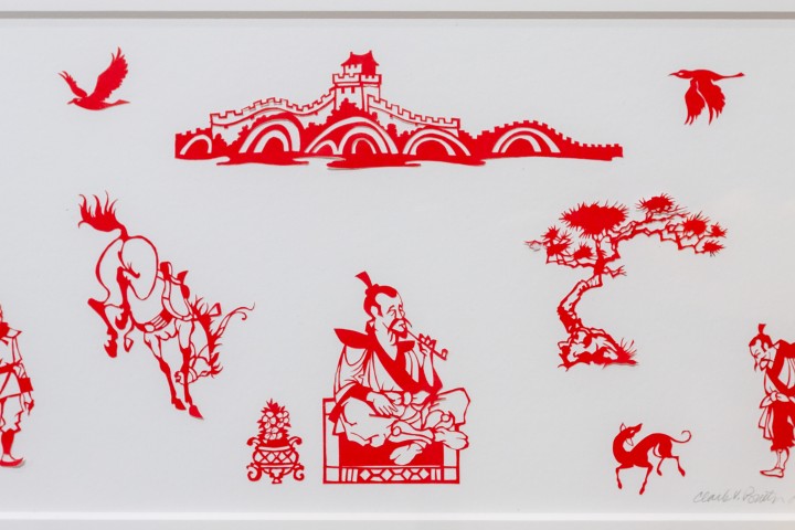 Clark Britton, “Tales of Genji (castle)”, paper cut (ARCHIVE) Matted (16 x 20) and backed, ready to frame.
