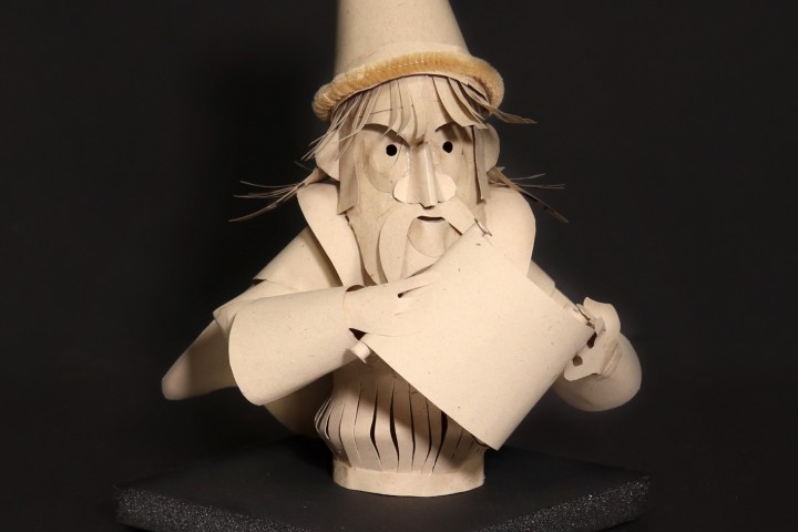 Clark Britton, “The Scholar”, cut paper (ARCHIVE) Hand cut & assembled. Mounted to black gator-board base.