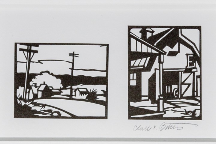 Clark Britton, “Two Views of Farmhouse (2)”, paper cut (ARCHIVE) Matted (11 x 14) and backed, ready to frame.