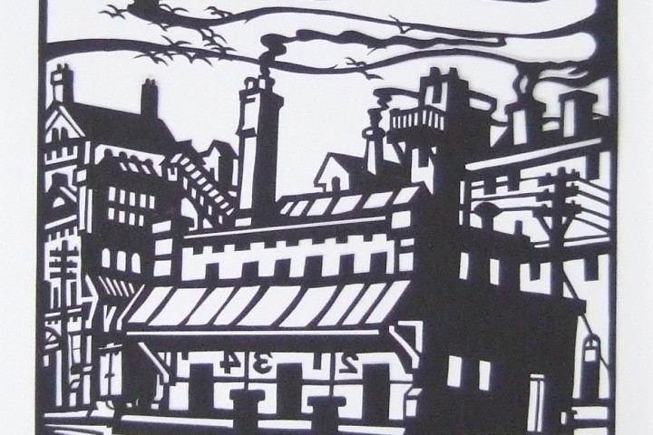 Architectural urban scene cut from one piece of paper. Matted and backed, ready to frame. More similar scenes available. Please inquire.