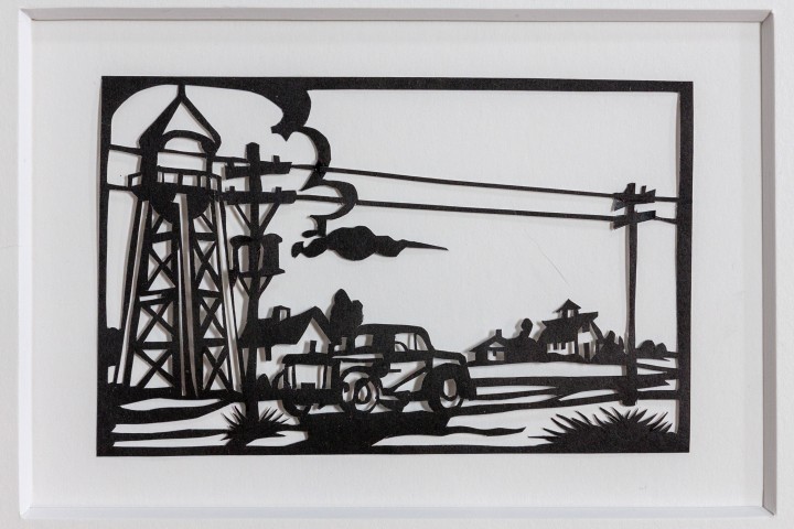 Clark Britton, “Watertower and Car”, paper cut (ARCHIVE) Archival matte in black frame (12 x 15); ready-to-hang.