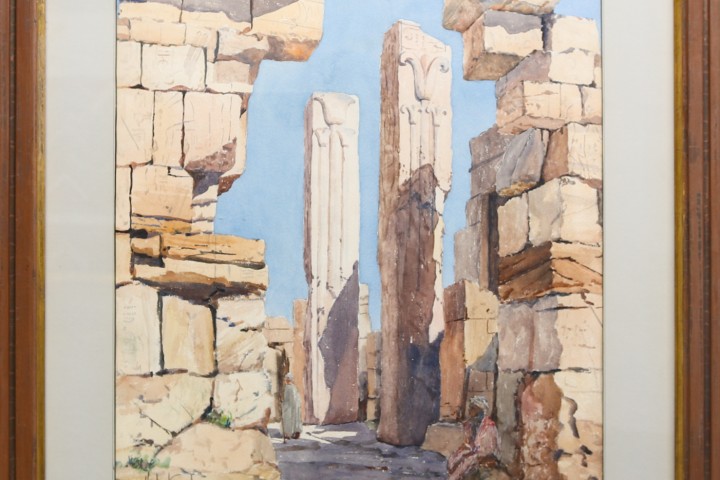 Clayton Staples, “Karnac (Egypt)”, watercolor on paper (SOLD) Featured in the original frame (33 x 27); ready-to-hang.