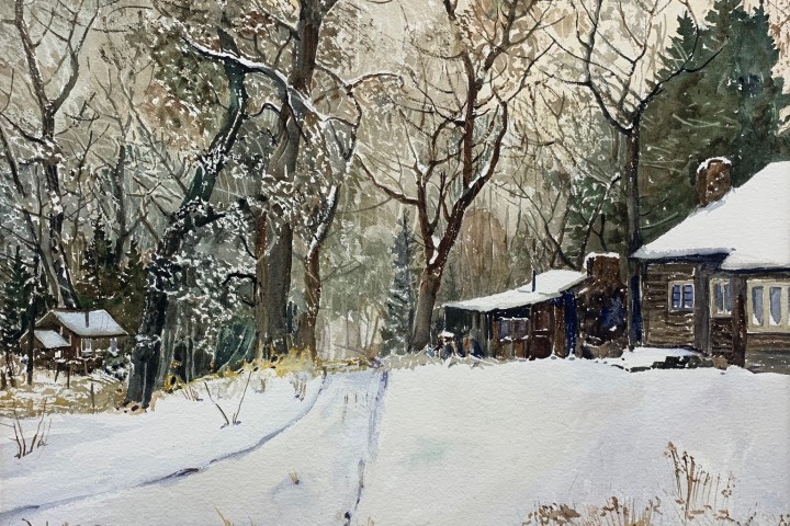 Clayton Staples, “Untitled” (Winter Scene with Cabin), Watercolor on paper (SOLD)