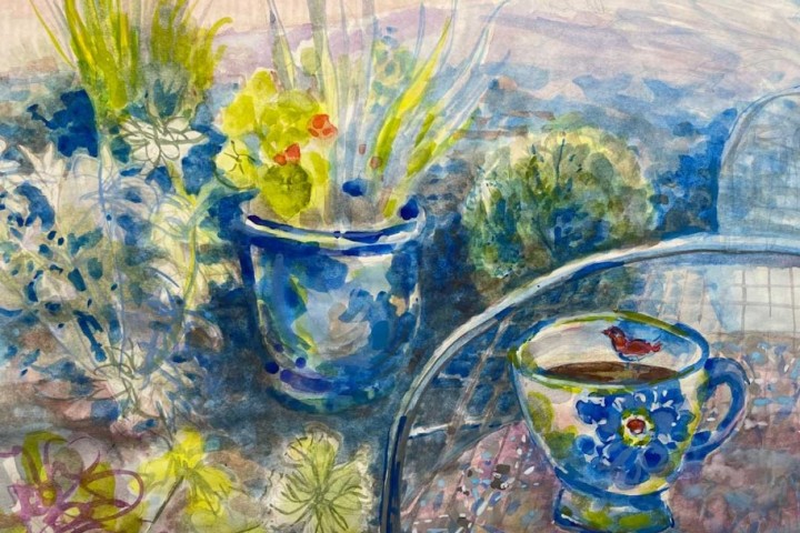 Denita Benyshek, “Morning Coffee in Garden 1, with table and blue pot”, Watercolor