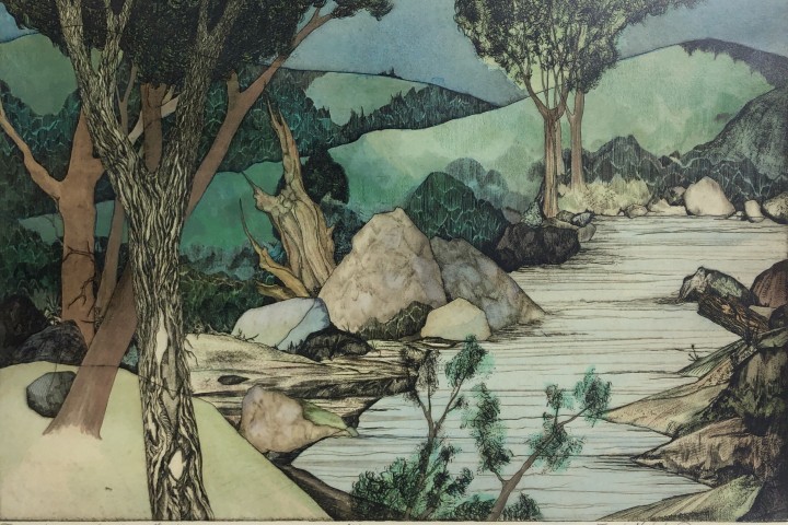 Frank Nichols, “Down Stream Variation #5”, Etching and colored ink (SOLD)