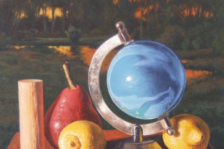 James Borger, “Earth Ocean”, acrylic on canvas (SOLD) Still life with evening landscape in background.