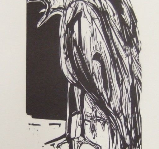 John Sandlin, “Ancient Blackness #3”, relief block print (SOLD) Relief print of bird. Photo cornered & sleeved. Edition 19 of 35.