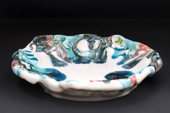 Joyce St. Clair Voltz, “Serving Platter”, porcelain w/ underglaze Intricate relief elements around the rim of platter w/ “satin” glaze.
