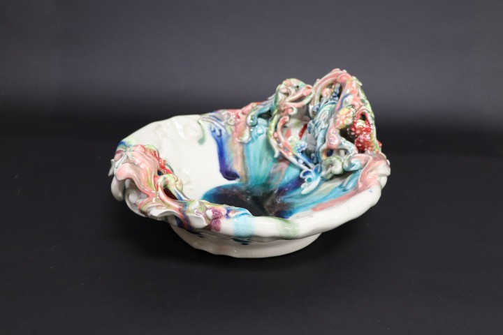 Colorful, intricate relief elements throughout; “pool” of satin glaze in center of platter.