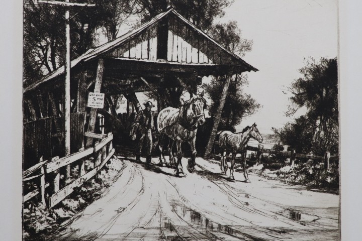 Unframed; Full margins, excellent condition. Pencil signed “Going Home” “Leslie Cope 1949 Gift Print of the Prairie Print Makers
