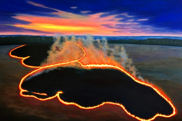 A large painting of a aerial drone view of a Kansas prairie fire at dusk. Unframed, gallery wrapped. View by appointment only.