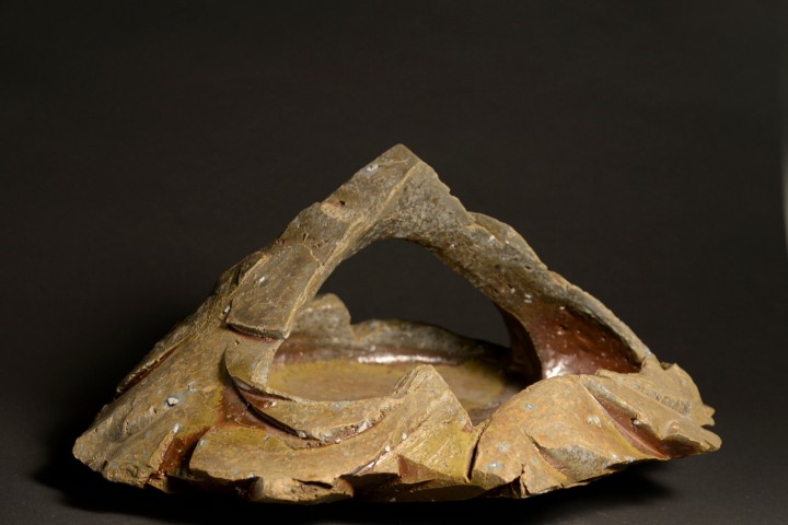 Lars Voltz, “Low Basket”, ceramic A stoneware tray with handle peaking over the top with endless textures and edges.