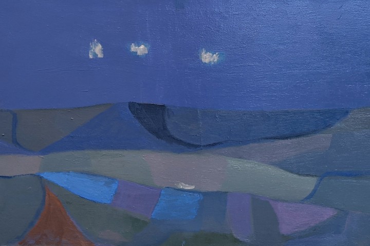 Patric Rowley, “Untitled (Landscape in Blue)”, oil on canvas (SOLD) Unframed w/ painted black edges. Artist signature in LR corner. Wired & ready-to-hang.