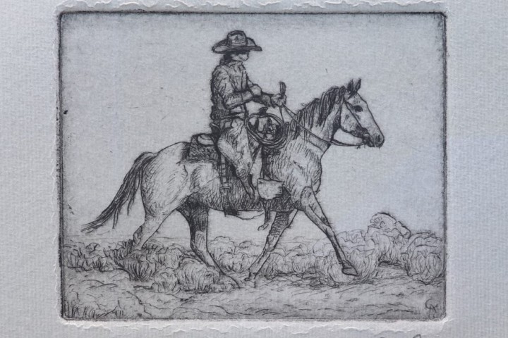 Phil Epp, “CA Rider”, etching Unframed. Printed on blue paper. Pencil signed “Phil Epp CA” “CA Rider”