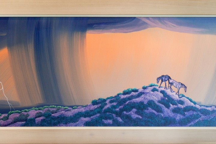 Phil Epp, “Lightning Storm”, acrylic on panel (SOLD) Grazing horses over a pasture during a lightning storm. Framed and ready-to-hang.