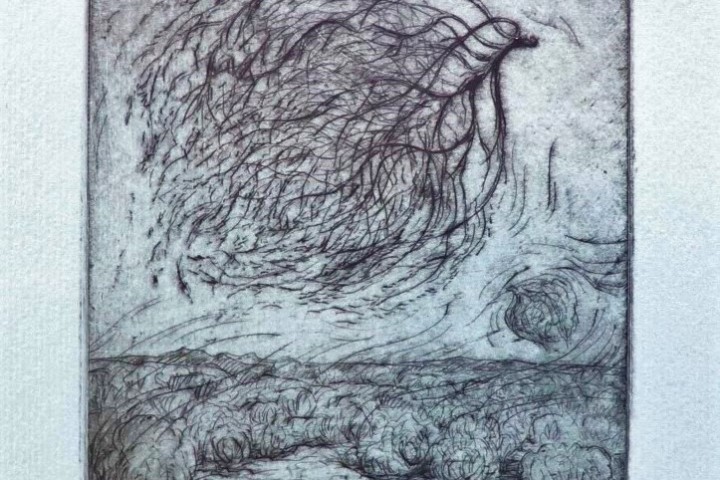 Phil Epp, “Tumbleweed in Flight”, etching Unframed. Printed on blue paper. Pencil signed “Phil Epp CA”