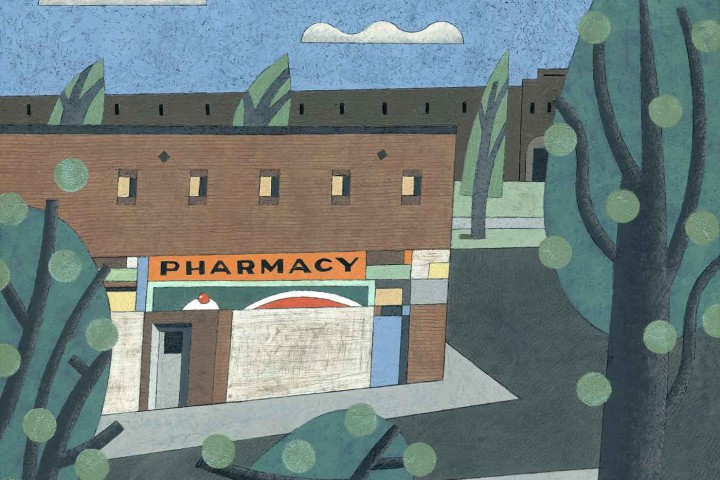Rebecca Hoyer, “Palimpsest”, Oil on panel (SOLD) High vantage point of Wichita building on Douglas Ave.