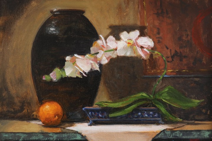 Richard Davies, “Orchid and Brown Vase” oil on panel (ARCHIVE) A still life painting of a blooming orchid next to a dark vase and an orange. Framed.