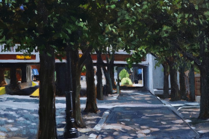 Richard Davies, “Trees on Douglas” oil on panel (ARCHIVE) An Old Town Wichita scene on Douglas Street of a walkway going through some trees. Framed.
