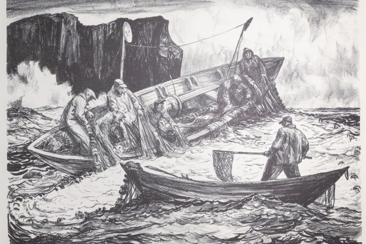 Robert von Neumann, “Fishing Off the Maine Coast”, lithograph Sleeved with Gift Prints of the Prairie Print Maker Presentation Portfolio.