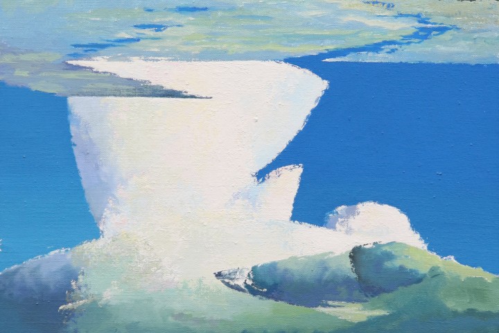 Ron Christ, “The Cloud,” acrylic on canvas (SOLD) An abstract painting of a Kansas cloud in the artist’s style. Thin wood floater frame.